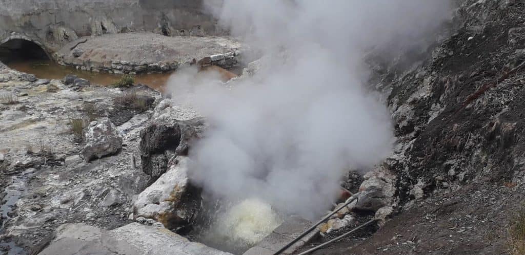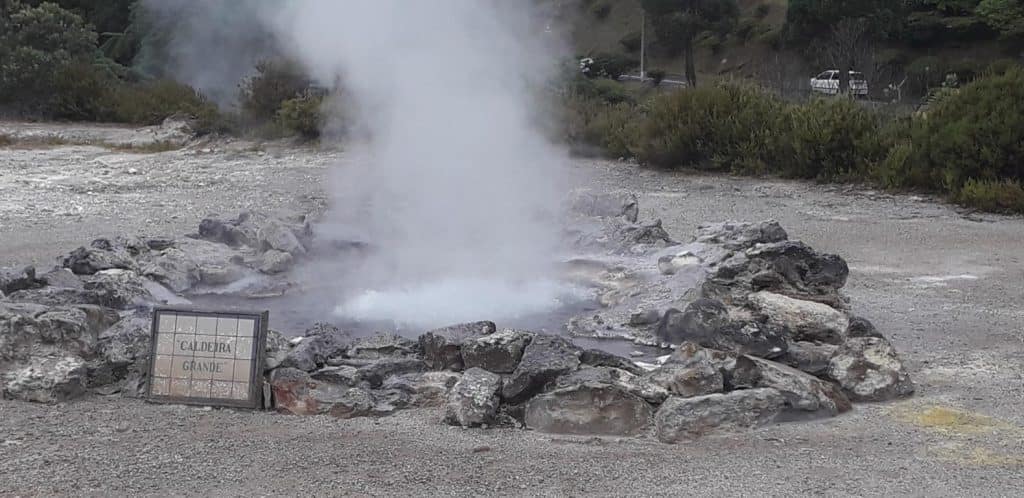 Como ainda era cedo para almoçar rumamos á caldeira das furnas, onde passeamos e observamos as caldeiras com água que chega á superfície borbulhante. É como estar muito próximo do vulcão, já que se pode ver as fumarolas, a água quente a borbulhar e sente-se o cheiro de enxofre vindo das profundezas.
