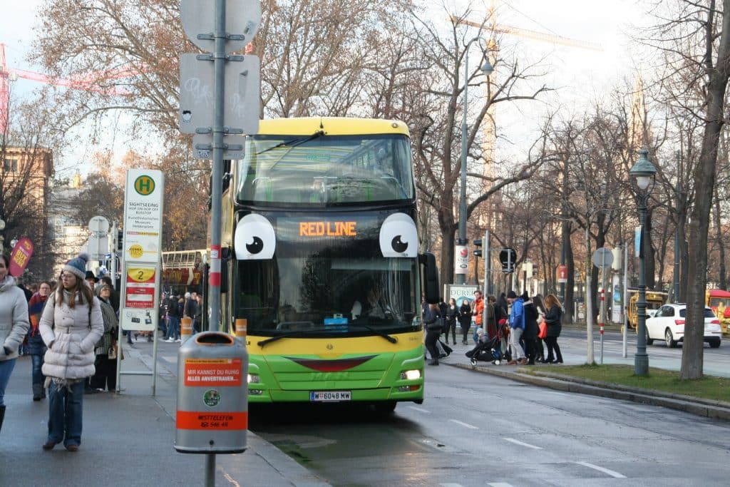 Tínhamos adquirido os Viena flexipass. Estes podem ser comprados na internet no site www.flexipass.com e são válidos para 3, 4 ou 5 atrações. Nós escolhemos os passes de 3 atrações sendo que hoje gastamos a primeira nos circuitos Hop on Hop off. Trocamos o voucher no balcão do sightseeing e seguimos para iniciar os nossos passeios. Optamos em primeiro pela Red line já que nos pareceu passar por mais locais da nossa preferência.