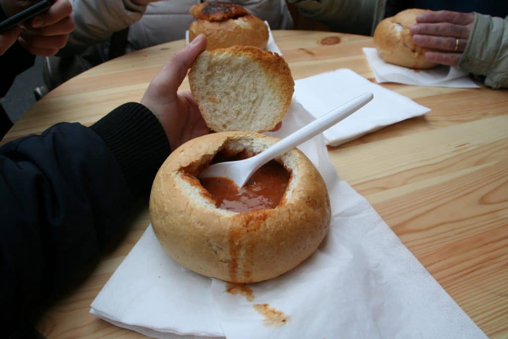Aproveitamos para almoçar por aqui a fantástica sopa goulash servida em taças de pão que têm sido as delícias da família! Sim, gostamos de sopa e esta é verdadeiramente deliciosa a tal ponto, que nem a taça escapa!