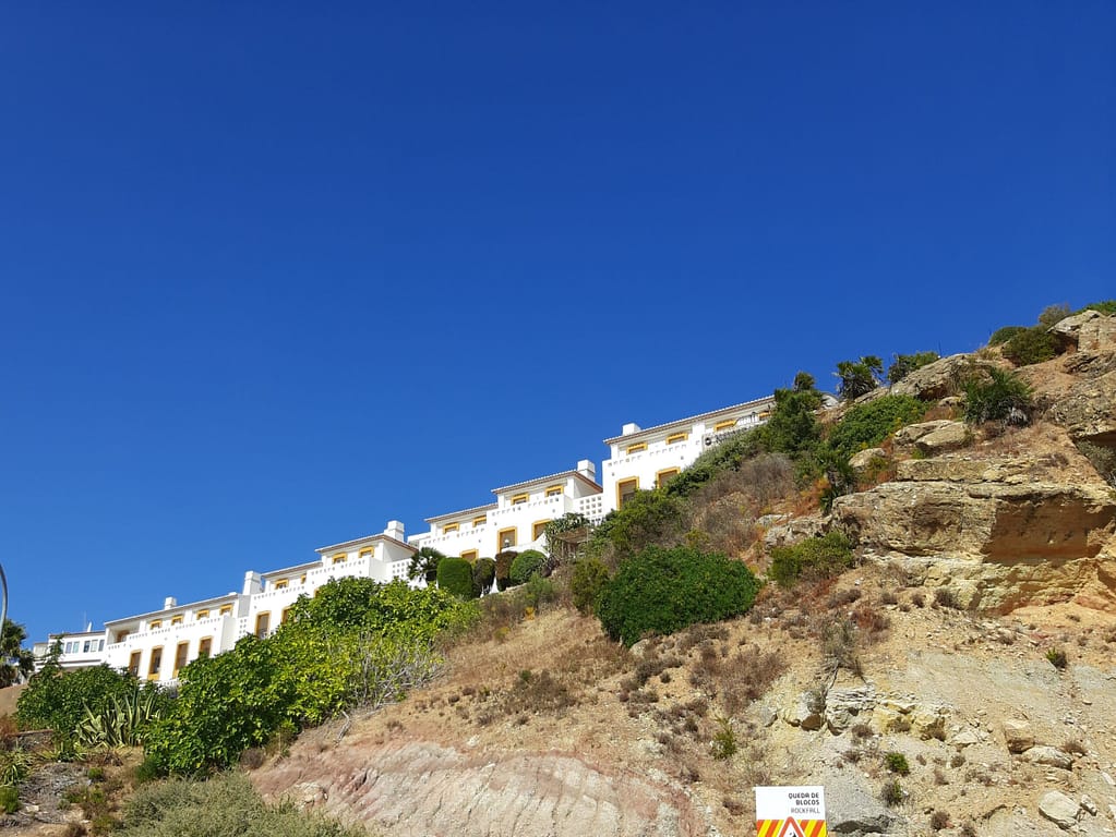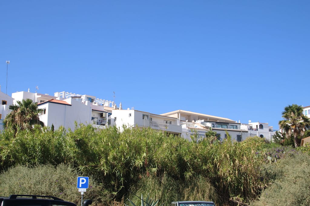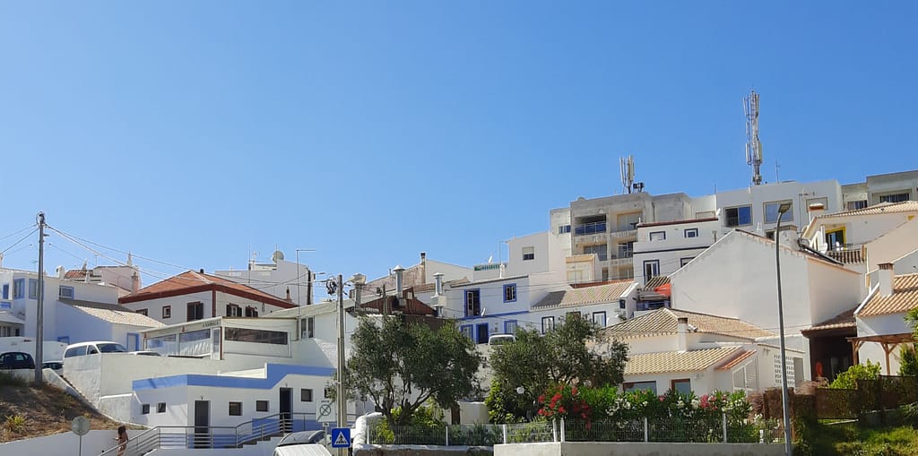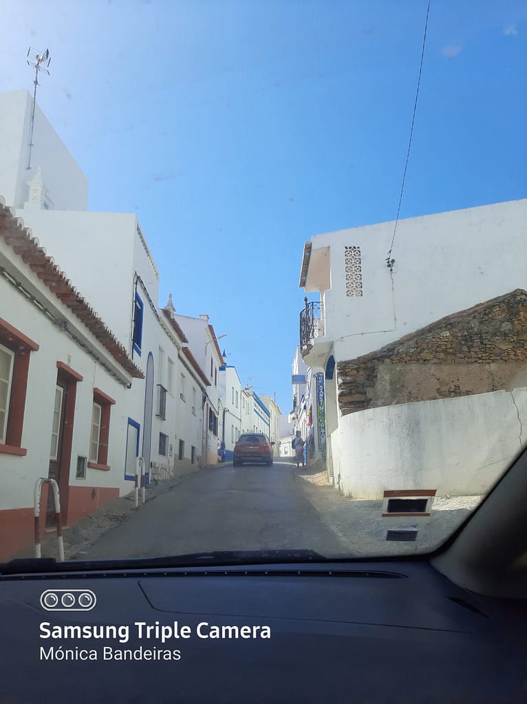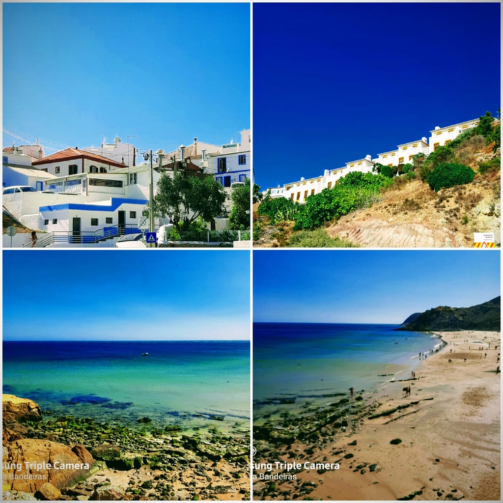 Por entre as encostas das falésias aninha-se uma aldeia de casas branquinhas e azuis pontilhadas com o colorido das flores que nos transporta para as construções gregas ao sol com o mar como horizonte.