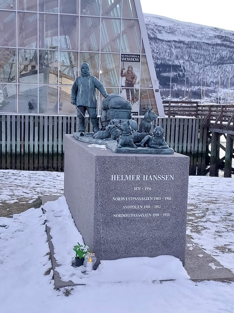 Detrás da estátua podemos ver o MS Polstjerna, um navio de caça às focas, sendo o melhor preservado da Noruega e é propriedade do museu da Universidade de Tromso.