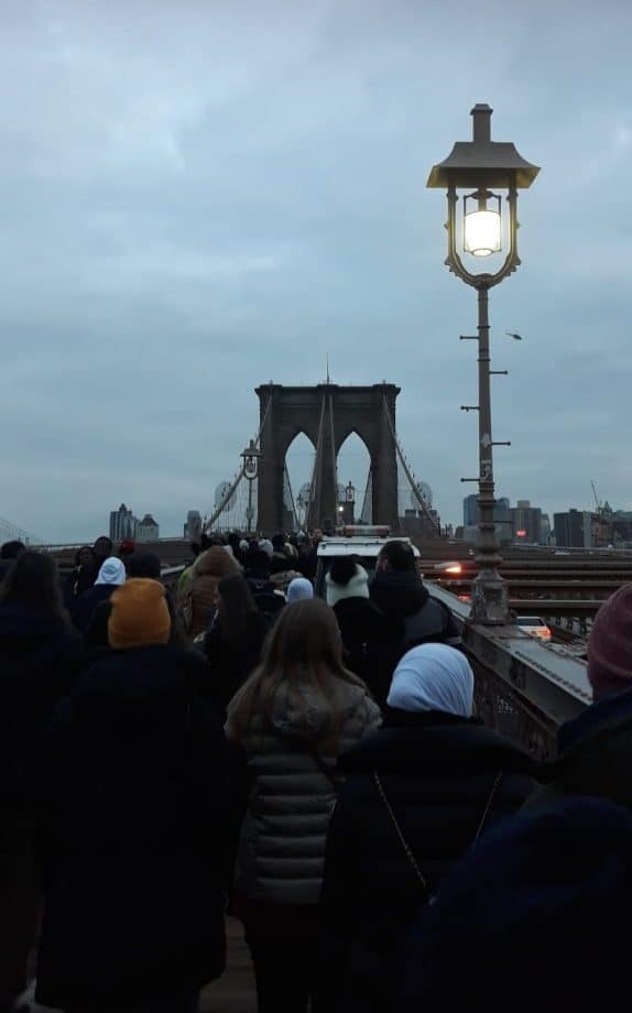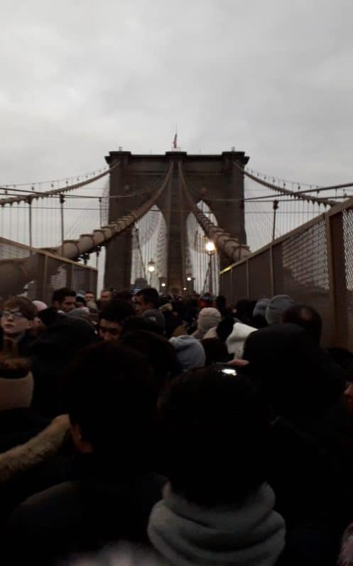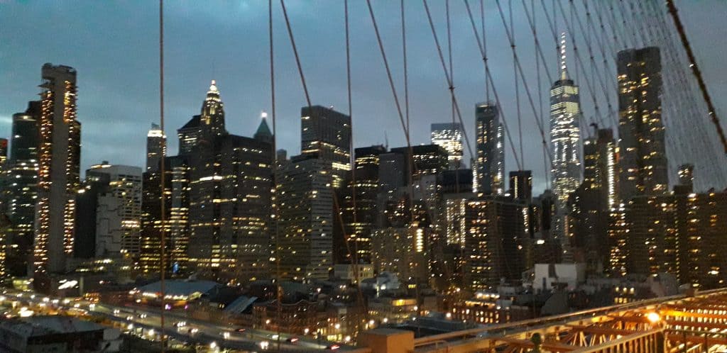 Depois aproveitamos o metro e seguimos para a Brooklin Bridge. O passeio pela ponte é tudo o que esperávamos, vimos o anoitecer a cair e a cidade a iluminar-se para a noite. É preciso ir carregado de tempo e paciência pois estão milhares de pessoas a tentar fazer o mesmo que nós, passear e fotografar a cidade e a ponte, e como parece ter havido um boom de gente este fim de semana em Nova Iorque, a ponte estava cheia por todo o buraquinho. Claro fizemos tal como toda a gente a sessão fotográfica a que tínhamos direito, com dezenas de fotografia em todas as posições e ângulos. Aquelas fotos que vemos por todo o lado, estão ali ao estender da mão, é só clicar tantas vezes como queiramos.